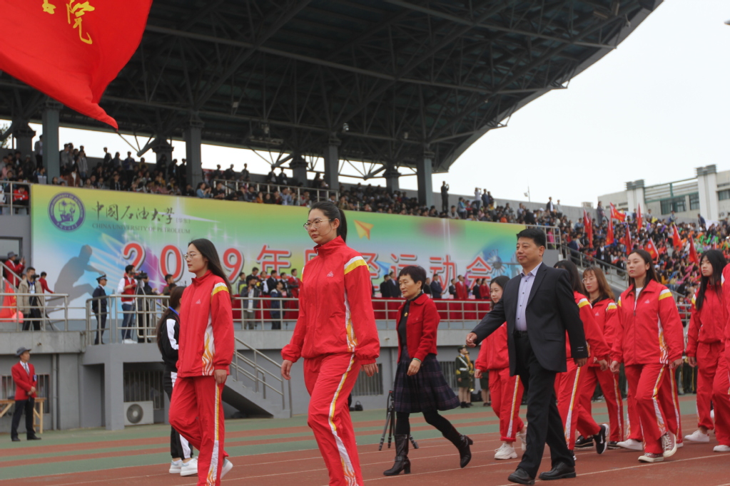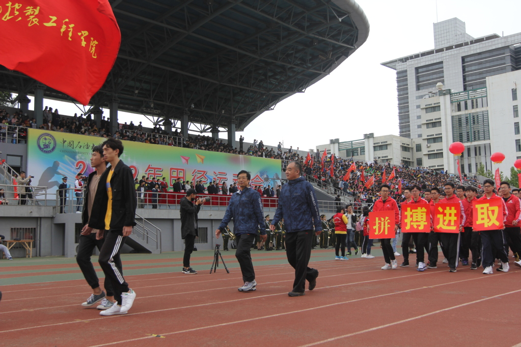 石油工程学院代表队,走在队伍前面的是党委书记赵放辉同志和工会主席张卫东同志。