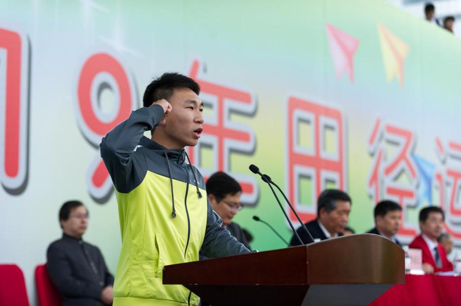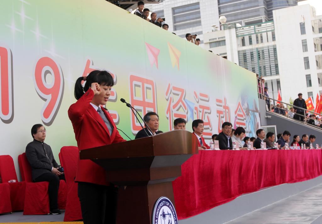 裁判员代表、体育教学部于晓红,运动员代表、材料科学与工程学院齐天一分别宣誓。