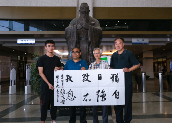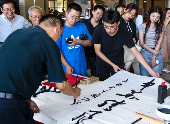活动现场,人头攒动,求字学子络绎不绝。“铺纸、润笔、蘸墨、运笔”一幅“中华腾飞”遒劲有力得赫然现于纸上。短短两个小时里,师生各展所长,围绕“庆祝新中国成立70周年”主题,饱含深情地创作了多幅风格多样的书画作品。“为青春加油!为祖国奉献!”前来观摩的学生激动地说,笔会不仅让自己欣赏了高水平艺术,同时求字勉励自己刻苦奋进。