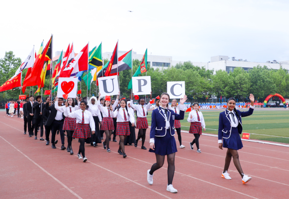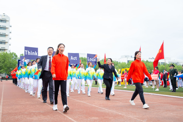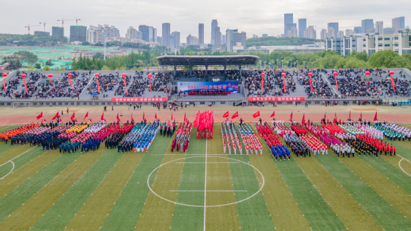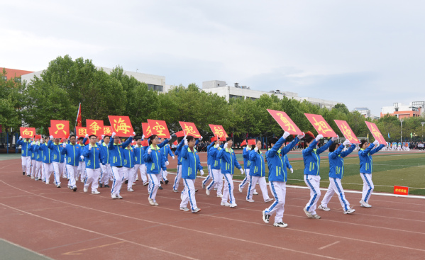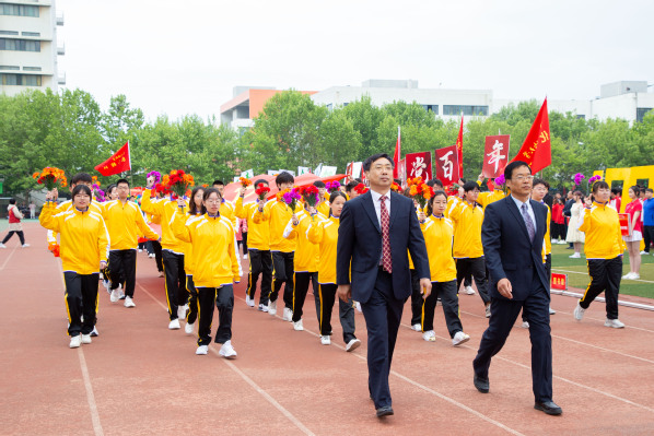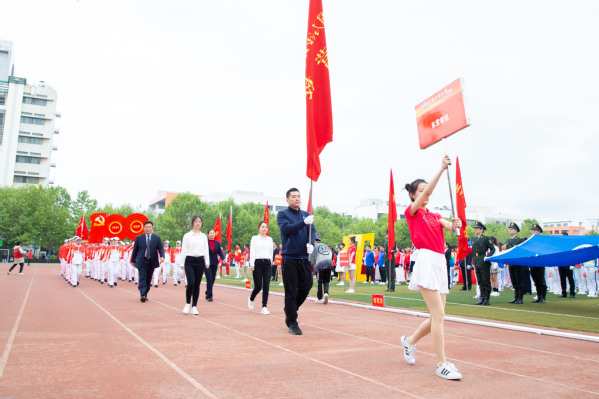 整齐划一的步伐,铿锵有力的口号,全神贯注的神情,一丝不苟的态度,走在最前方身着军装的护旗手们带领着红旗方队缓缓走来,紧随其后的是裁判员、各教职工、学生代表队,各代表队色彩斑斓的着装使运动场上洋溢着青春亮丽的气息。“起来,不愿做奴隶的人们……”伴随着庄严的国歌,在全体师生的注目礼中,五星红旗缓缓升起。