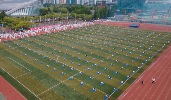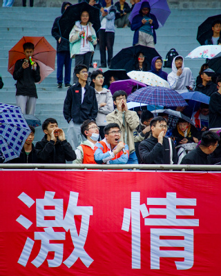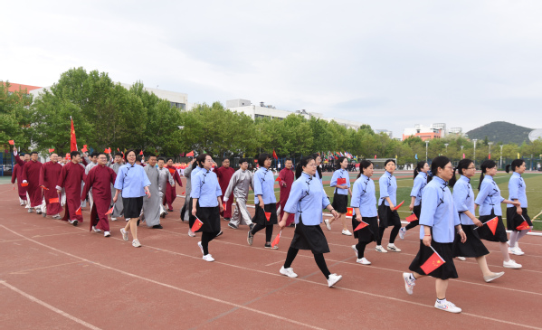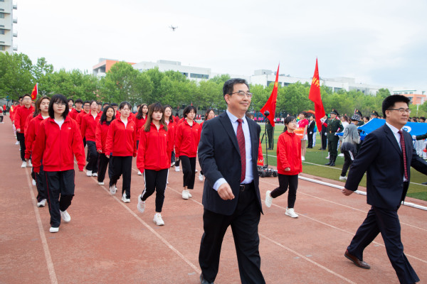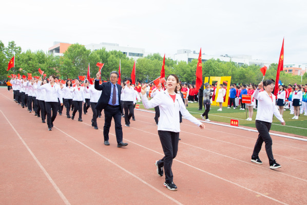 运动场上一片欢腾。学生柔韧的瑜伽表演伴随着《歌唱祖国》的旋律,展现出大学生的青春朝气;利落精到的太极拳表演彰显了教职工的昂扬风采;刚柔并济的太极扇一展文化之韵,气势恢宏,队伍跟随激昂的音乐变换队形,用太极扇摆出“中国共产党”“100”等字样,献礼建党100周年。在观众的阵阵欢呼与掌声中,2021年田径运动会正式拉开了大幕。
