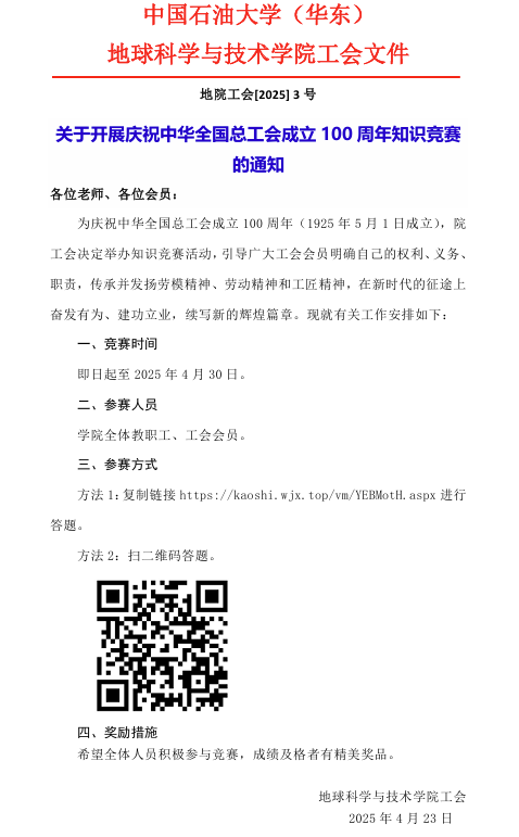 为庆祝中华全国总工会成立100周年,地学院工会近期举行了“庆祝中华全国总工会成立100周年知识竞赛”活动,引导广大工会会员明确自己的权利、义务、职责,传承并发扬劳模精神、劳动精神和工匠精神,在新时代的征途上奋发有为、建功立业,续写新的辉煌篇章。